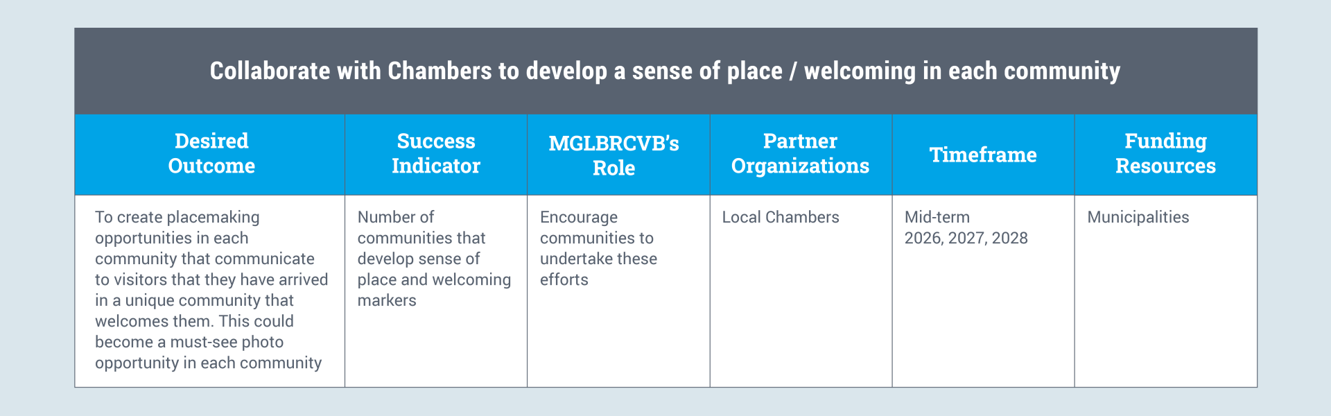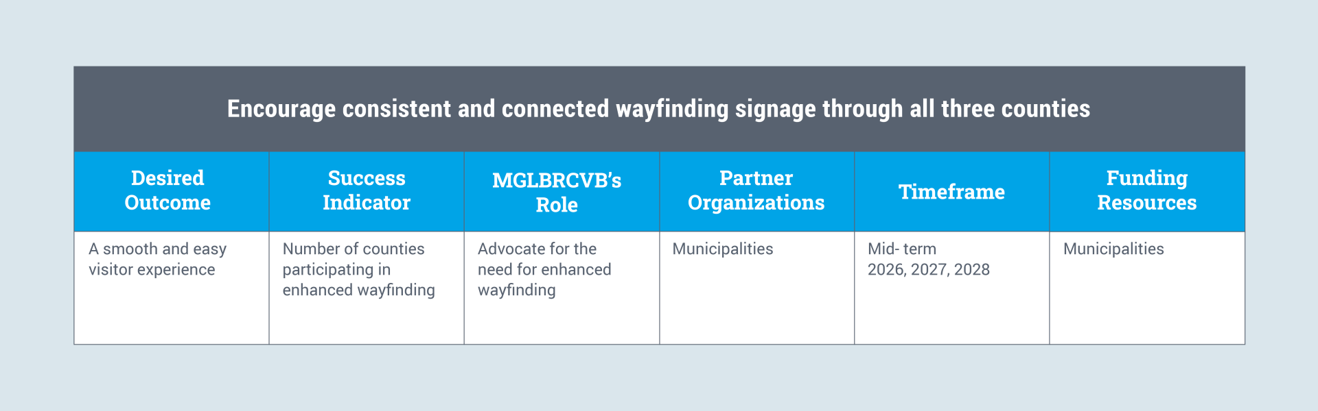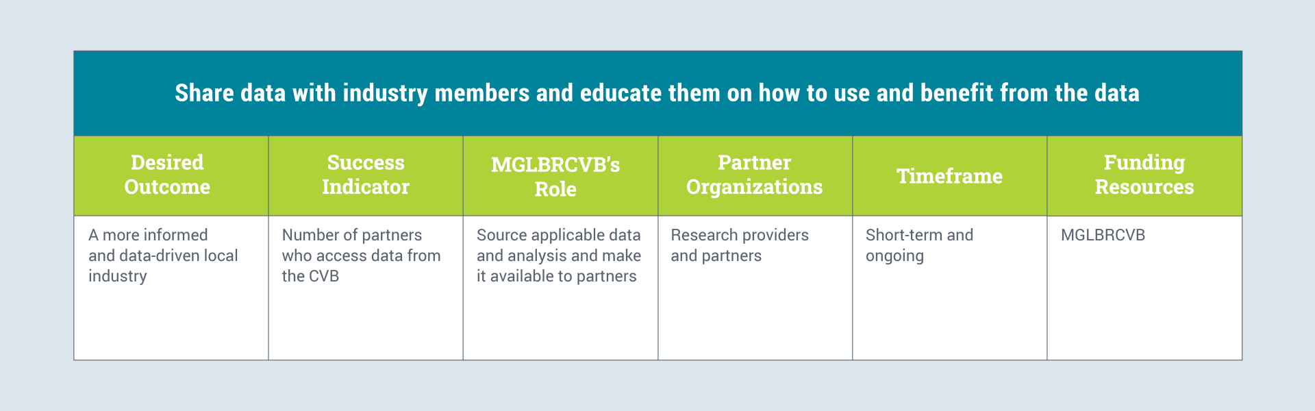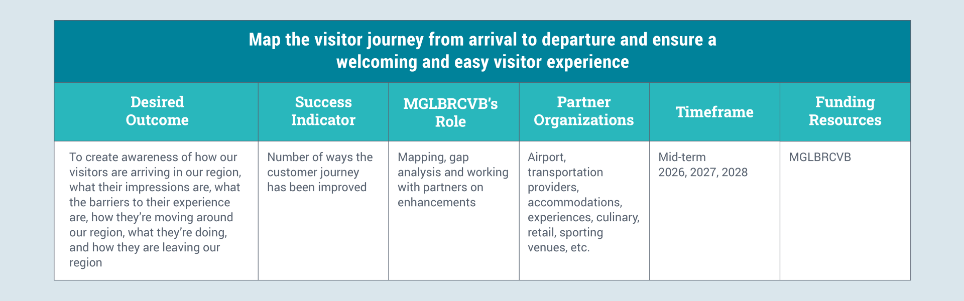 It is important to note that the MGLBRCVB will play a role in each strategic goal, however that role will vary. Partner organizations will also participate in the implementation and success of these goals, for the benefit of the region.