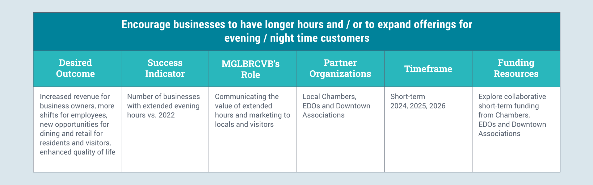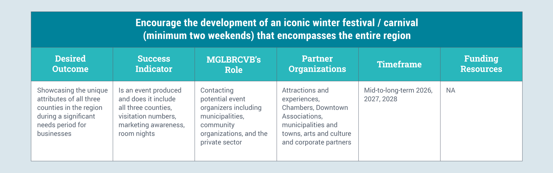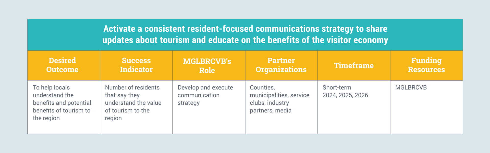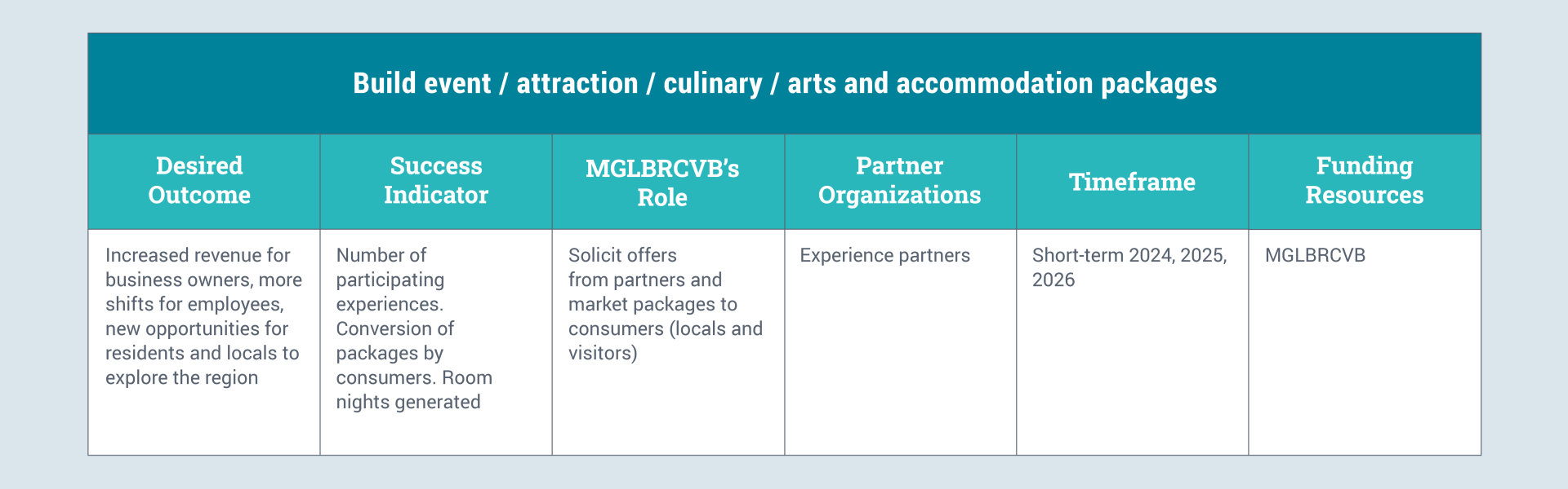 It is important to note that the MGLBRCVB will play a role in each strategic goal, however that role will vary. Partner organizations will also participate in the implementation and success of these goals, for the benefit of the region.