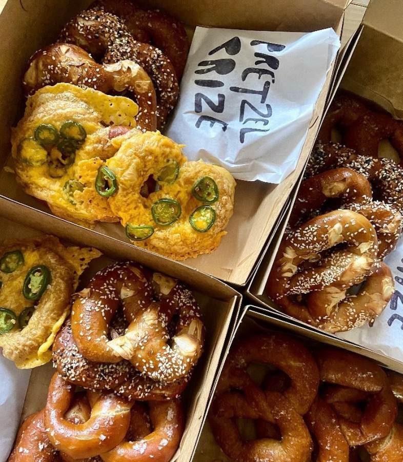 Pretzel Prize: Hand-rolled, Portland-style, soft, buttery pretzels — pulled, twisted, and baked fresh daily. Jalapeño Cheddar, Spicy Dill Pickle, Truffle Parmesan, Garlic Sesame, Confetti Everything, Cinnamon Sugar. Pre-order for local pick-up, or watch for pop-ups at local shops!