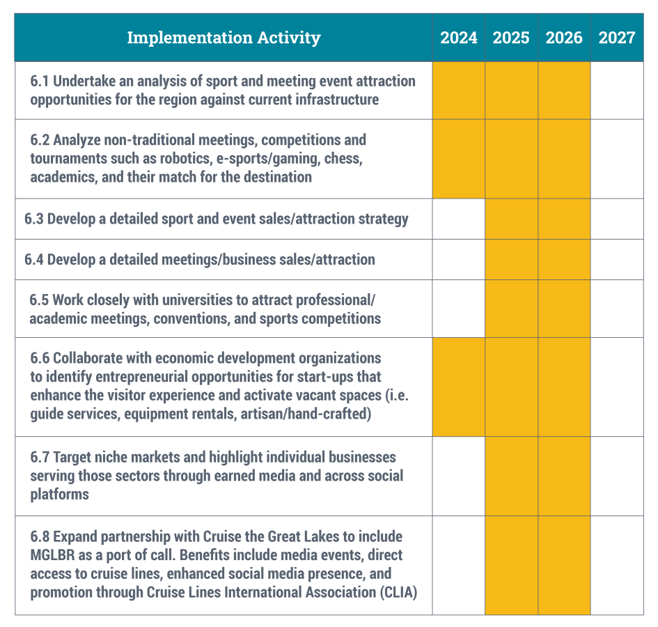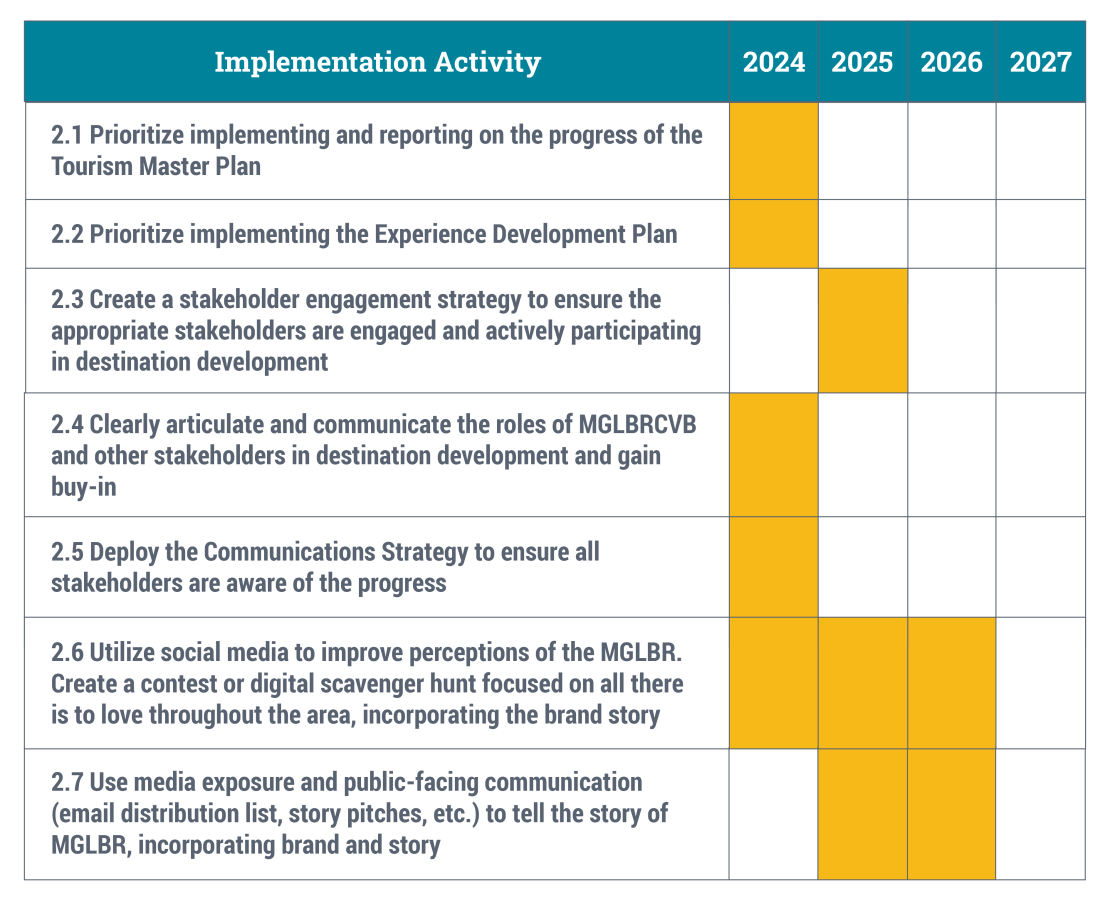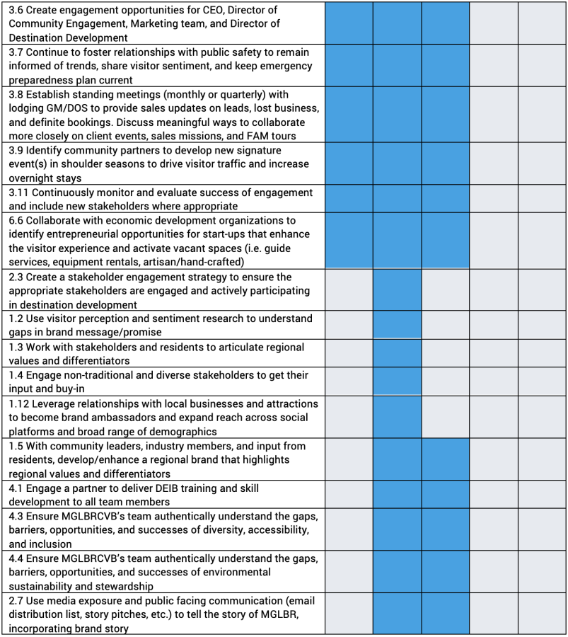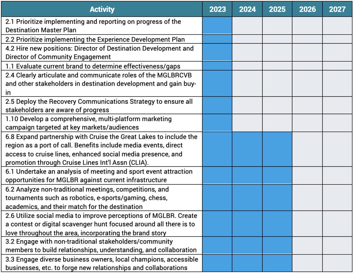 As a result of the research, stakeholder and resident engagement, and economic forecasting, the strategies for MGLBRCVB are outlined below, with periods of activity indicated by shaded areas on the implementation charts.