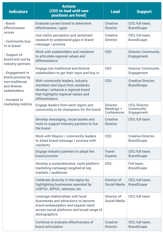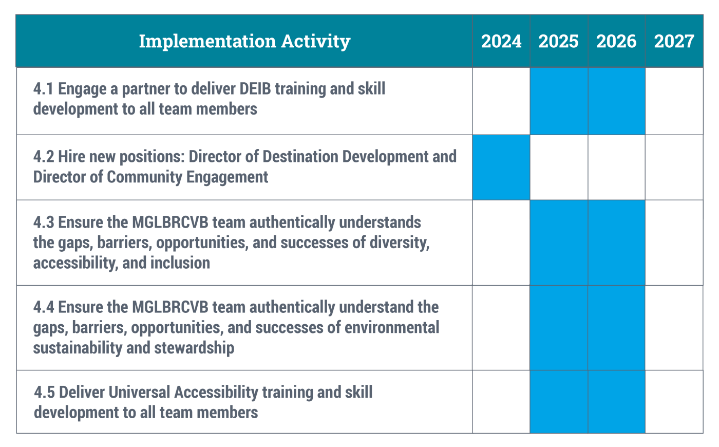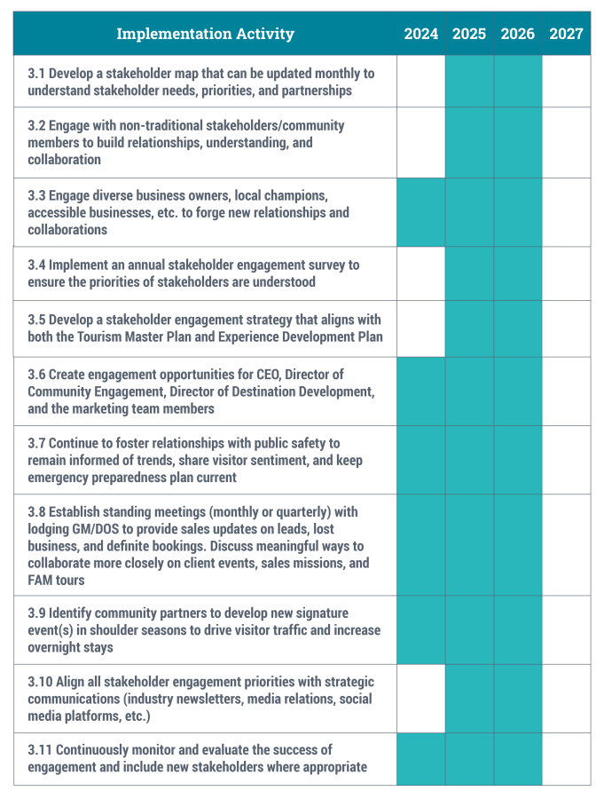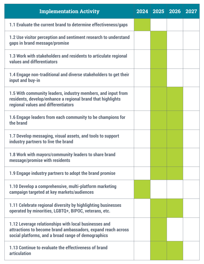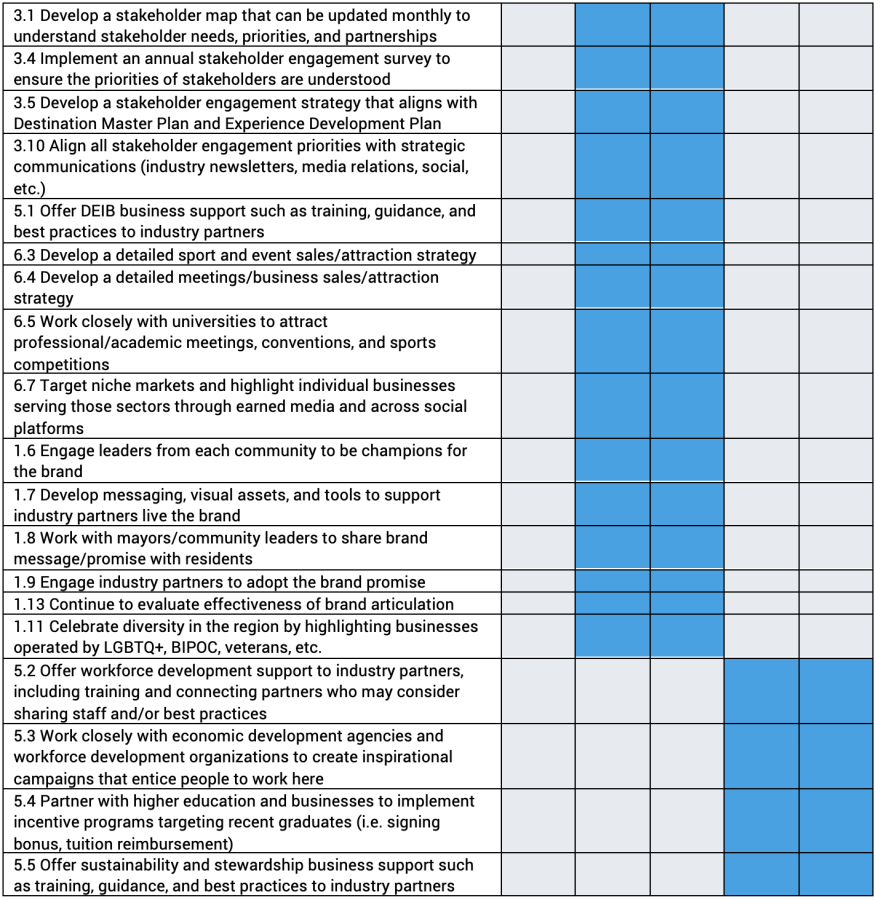 As a result of the research, stakeholder and resident engagement, and economic forecasting, the strategies for MGLBRCVB are outlined below, with periods of activity indicated by shaded areas on the implementation charts.
