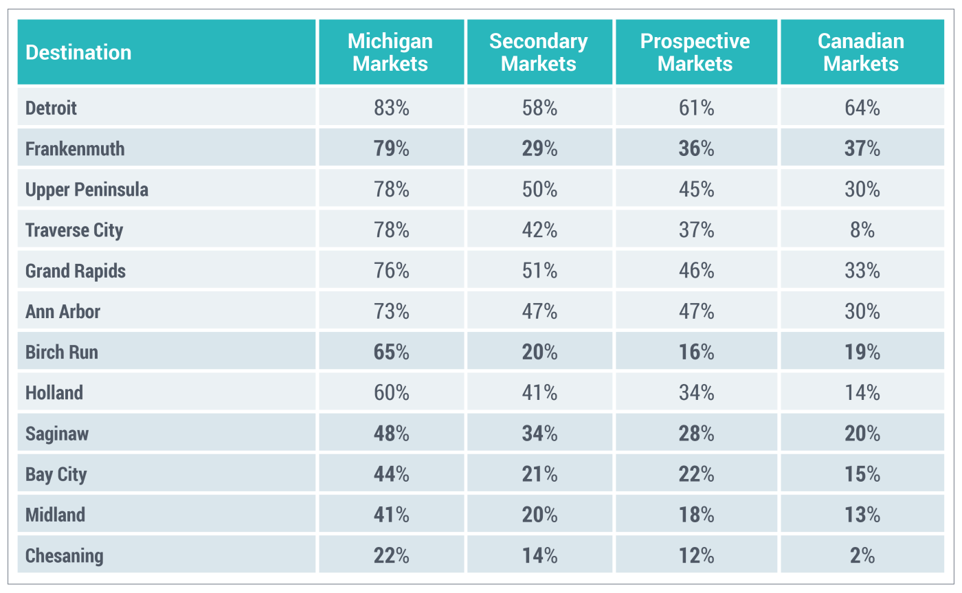 The region is well-positioned to leverage the drive market within Michigan and surrounding states. Customized messaging tailored to visitors based on their market and demographic will require specialized content. Michigan residents are most familiar with the region while Canadians and out-of-state visitors will need more detailed information to inspire travel.
