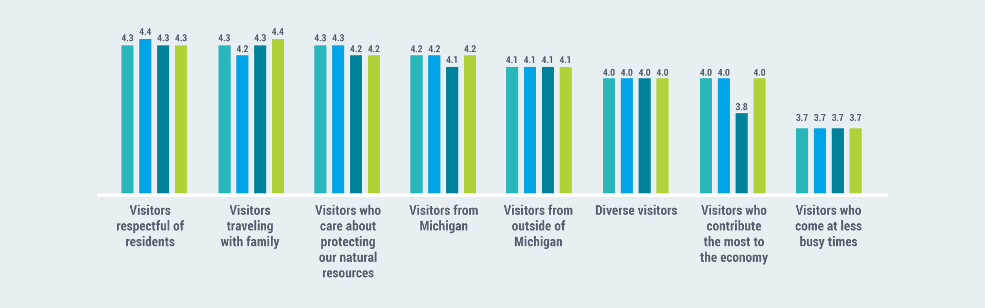 Residents view their region as being naturally scenic, defined by bodies of water, and ideal for families. They would prefer visitors who respect nature and share these values.