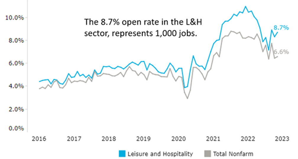 Nationwide, statistics from Haver Analytics reflect more than two job openings exist for each unemployed person. Despite this, the leisure and hospitality industry has seen more than 20% wage growth since 2019. The tourism industry is particularly hard hit by workforce shortages in restaurants and accommodations, with 1 in 9 jobs remaining unfilled.
