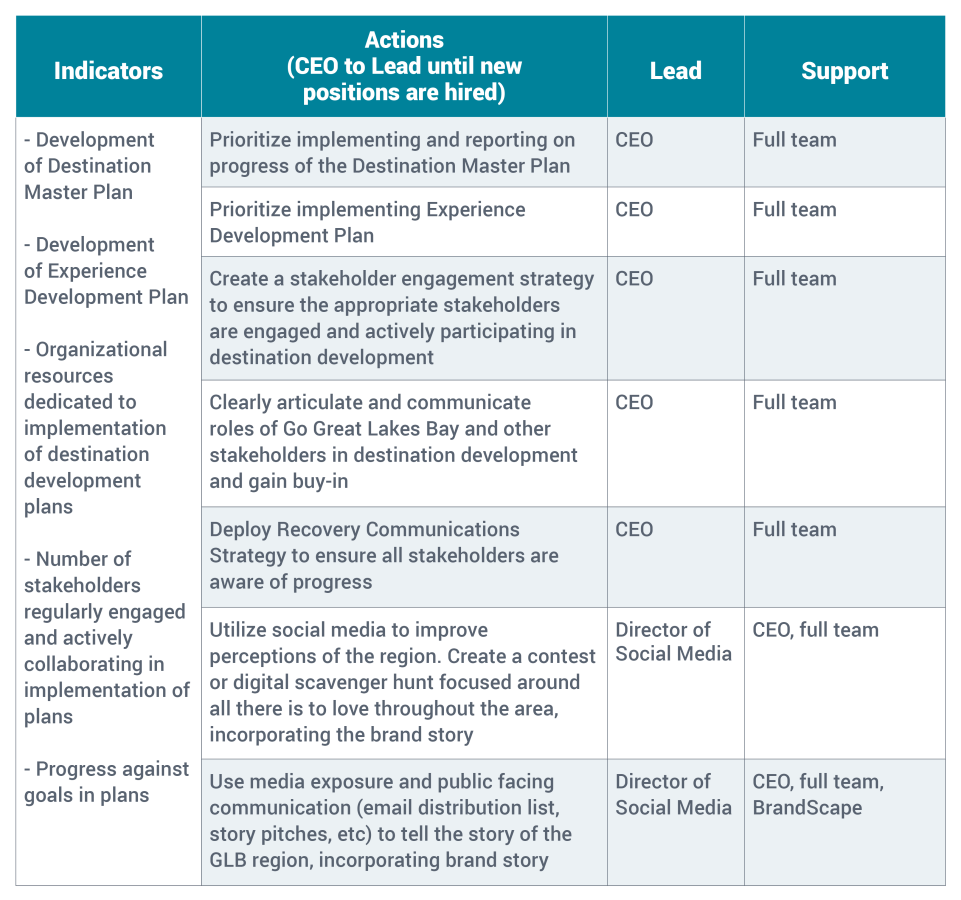 The strength and capabilities of the MGLBRCVB’s team are a significant asset to the organization and the industry in the MGLBR. Appropriately, the team redirected much of its focus to responding to the COVID-19 pandemic and the 100-year flood, and unfortunately had to downsize to stay afloat. Now, to fully recover and effectively respond to the changed needs of the industry and visitors, new organizational roles are recommended. These roles will broaden the bandwidth of the existing team, bring new skills to the organization, and prepare the MGLBRCVB’s team for the implementation of this Strategic Plan and the future Tourism Master and Experience Development Plans.