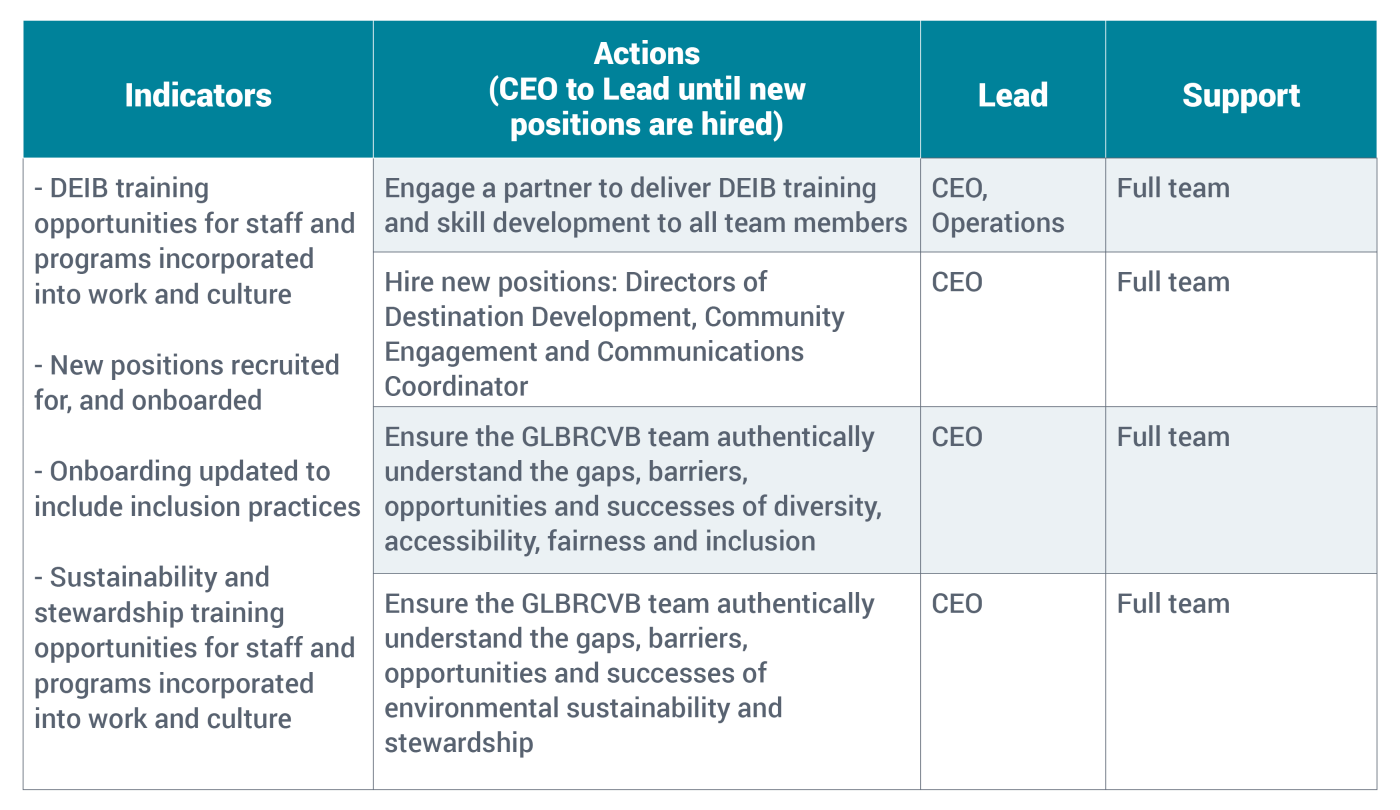 Focus should be placed on diversity, equity, inclusion, and belonging (DEIB) when building the capacity of the MGLBRCVB team. DEIB training for all staff and updating internal practices will ensure that the entire team authentically understands the gaps, barriers, opportunities, and successes in the region.