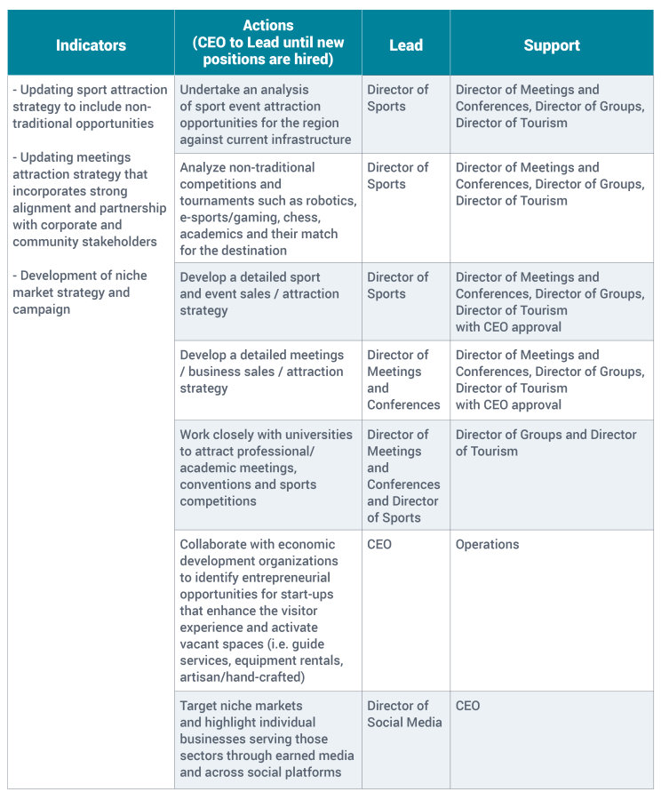 An updated meetings and conferences attraction strategy will incorporate strong alignment and partnership with corporate and community stakeholders. Working closely within the community to build connections between business professionals, economic development organizations, and education partners will create an opportunity to strategically capitalize on this market to expedite the industry’s recovery in a collaborative way.