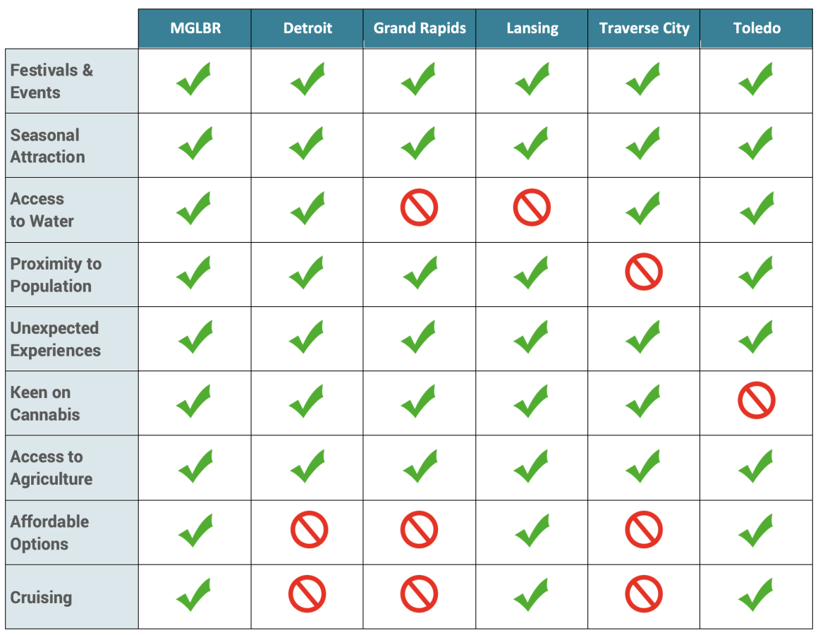 Until federal legislation exists, Michigan and MGLBR stand to benefit from the growing popularity surrounding cannabis tourism. Neighboring Ohio legalized possession of small amounts of marijuana, but recreational use is still prohibited, and Indiana is currently exploring the possibility of legalization, but statutes prohibit possession, which provides an opportunity for promoting local access and responsible consumption to this niche market. This differentiator reinforces proximity as a distinction for MGLBR.