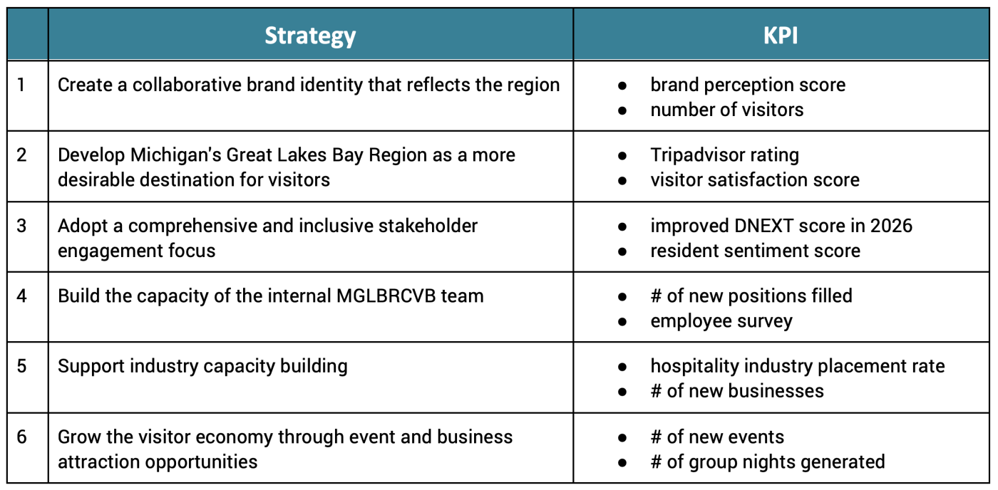 Michigan's Great Lakes Bay Regional Convention and Visitors Bureau (MGLBRCVB) continues to support its regional and industry partners in recovering from the impacts of the global COVID-19 pandemic and the 100-year flood by restoring consumer confidence and building a more resilient visitor economy. To support these efforts, the MGLBRCVB undertook strategic planning to guide the efforts with a clear and data-driven approach.