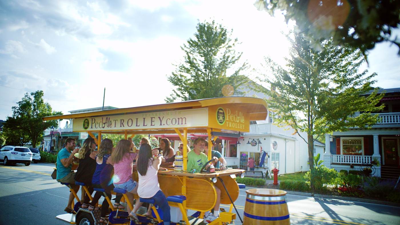 Bring adult beverages & friends for a colorful ride through Frankenmuth with PedAle Trolley, or grab single seats on evening pub crawls.