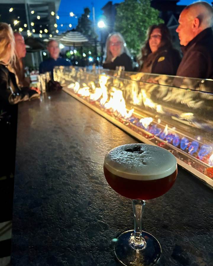 Gather by the fire bar at Prost! Wine Bar & Charcuterie to sample six tap wines, or handcrafted house specialty cocktails.