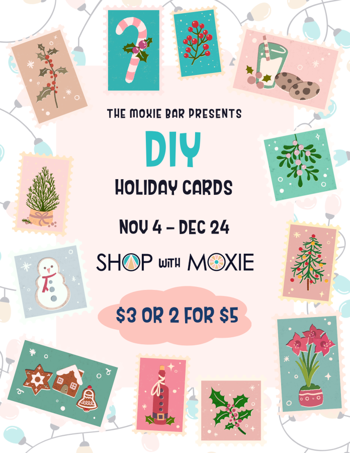 🎅✨ Christmas Card Moxie Bar! ✨🎄 December 2–24, Tuesday-Saturday, 10am-6pm Get your jingle on and make your very own merry masterpiece! 💌 We’ve got all the goodies — ribbon, washi tape, sparkly bits, and loads of festive flair — to help you craft the cutest Christmas cards around. 🎁🎨 💖 Just $3 each or 2 for $5! Come spread some holiday cheer, get crafty, and make something snow special this season! ☃️💫