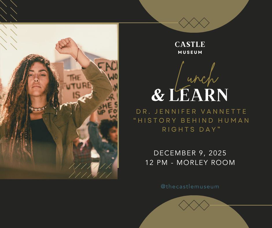 Join the Castle Museum's own Dr. Jennifer Vannette for a poignant discussion of the history of Human Rights Day each December. FREE. Bring your lunch or just yourself and join in the conversation. FREE.