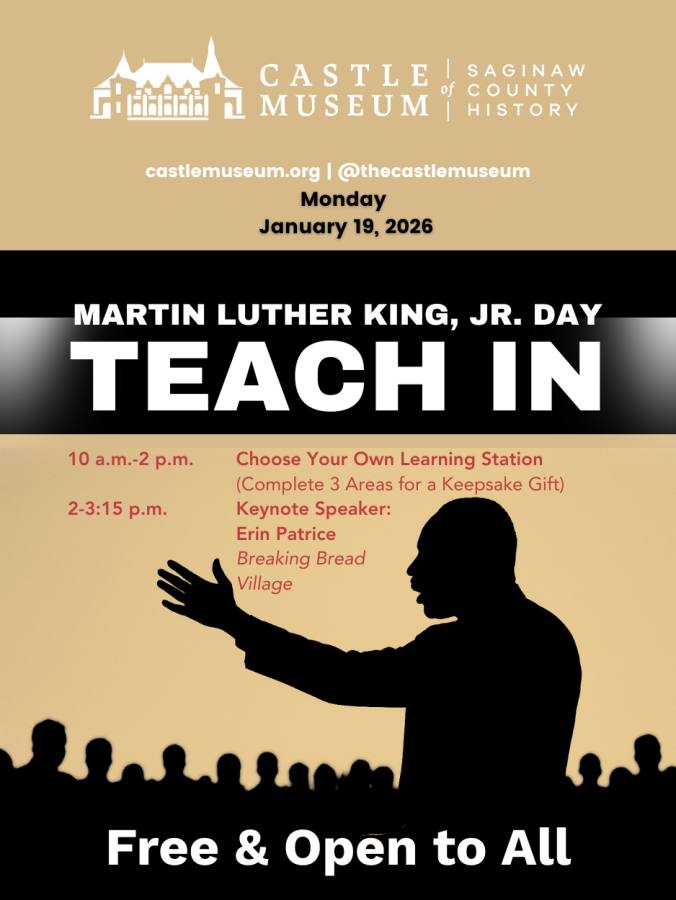 It is the third annual Martin Luther King, Jr. Day Teach-In at the Castle Museum! Start the morning of January 19 off from 10 a.m. until 2 p.m. with choose your own learning stations, appropriate for children of any age. Earn a free keepsake button for completing the stations. Then at 2 p.m. join us for our keynote address by Erin Patrice of the Breaking Bread Village. Take part in this annual, FREE, event in honor of a day of service and Martin Luther King, Jr.