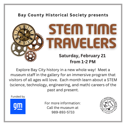 Explore Bay City history in a whole new way! Meet museum staff in the gallery for an immersive program that visitors of all ages will love. Each month learn about STEM (science, technology, engineering, and math) careers of the past and present. Funded by the GM Community Impact Grant.